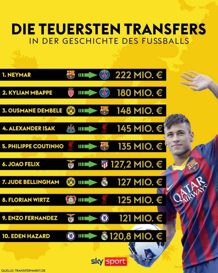 电子游戏官网-💰足坛历史最贵转会:内马尔2.2亿欧居首,伊萨克第4&维尔茨第8