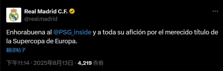 皇马向巴黎及球迷致以诚挚祝贺 欧洲超级杯夺冠当之无愧