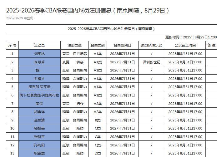 雷速体育8月29日讯 根据CBA官方的公示,南京同曦完成13主场,其中,外界关注的林葳,郭昊文均缺席,祝铭震成为队内唯一的顶薪球员。