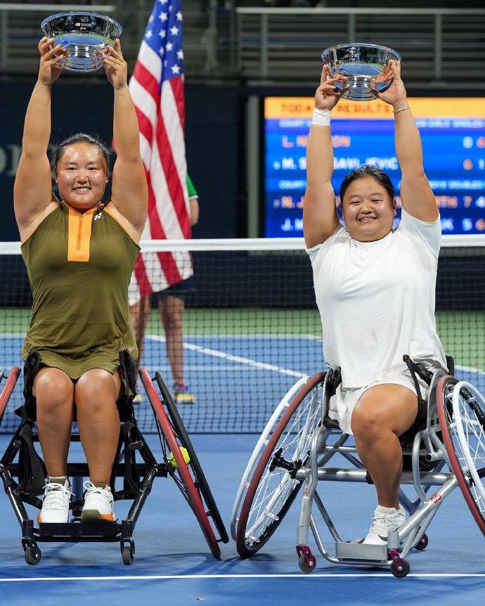 除了女双冠军,美网轮椅网球女双也决出了最终冠军,来自中国的组合李晓辉/王紫莹在第二盘1-5落后的情况下成功逆转,最终以6-4 7-6的大比分击败跨国组合朱珍珍/德格鲁特,捧起这个宝贵的冠军奖杯。