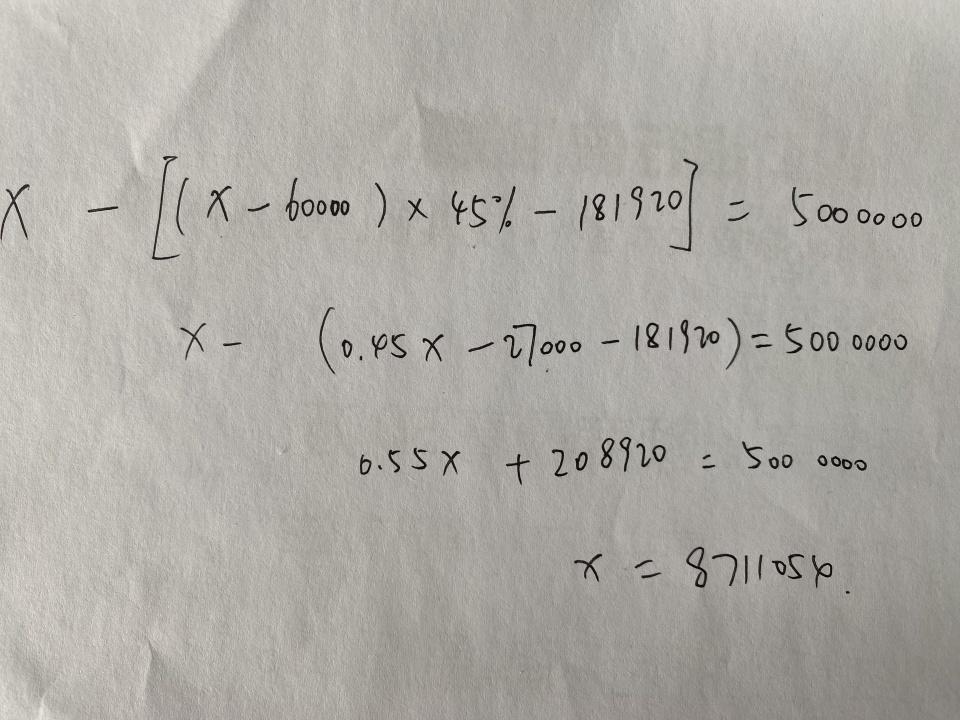 带着这个问题,笔者咨询了做财务的朋友,他给笔者列方程算了个账,见下图。给大家解释一下这其中每个符号和数字的意义,x代表税前金额、60000代表年个税起征点、45%代表超过96万元收入部分的税率、181920代表96万收入部分的扣除数。
